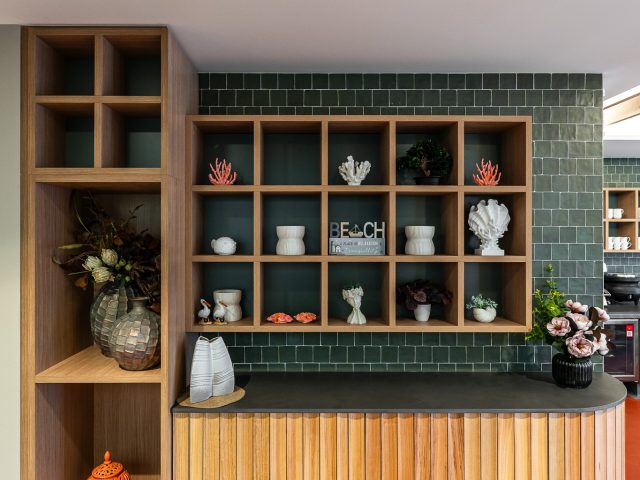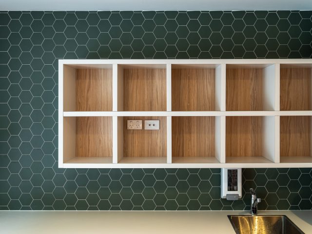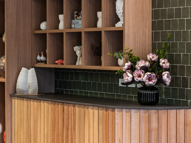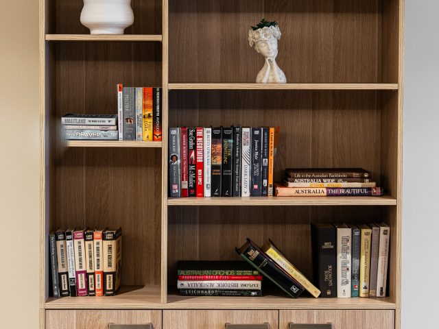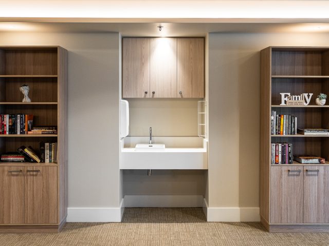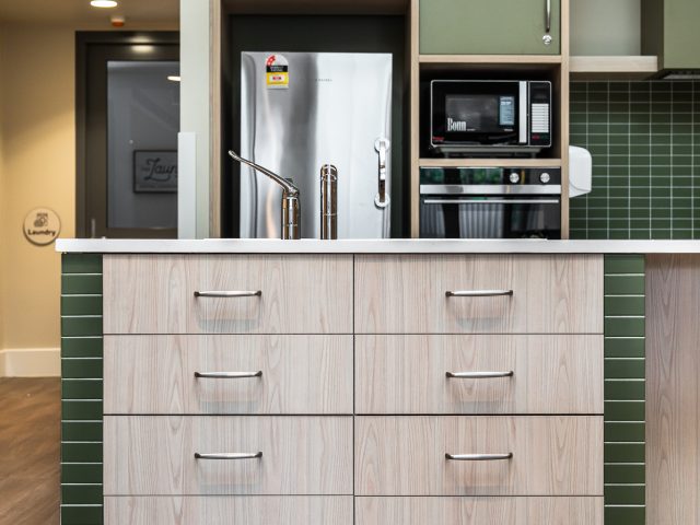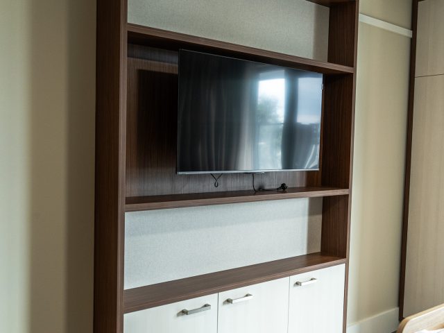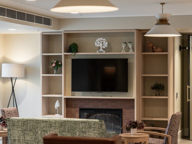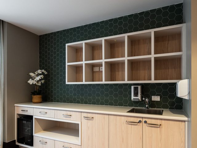 Our team delivered tailored joinery solutions across every resident room, including custom TV units, shelving, wardrobes, bathroom vanities, and built-in cabinetry — all designed for ease of use, safety, and accessibility. In the common areas, we manufactured and installed feature TV display walls with surrounding shelving, small kitchenettes, and even outdoor kitchens, blending practicality with homely comfort.