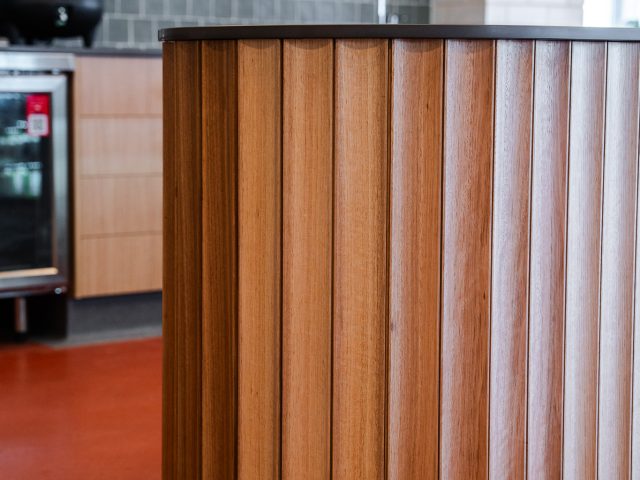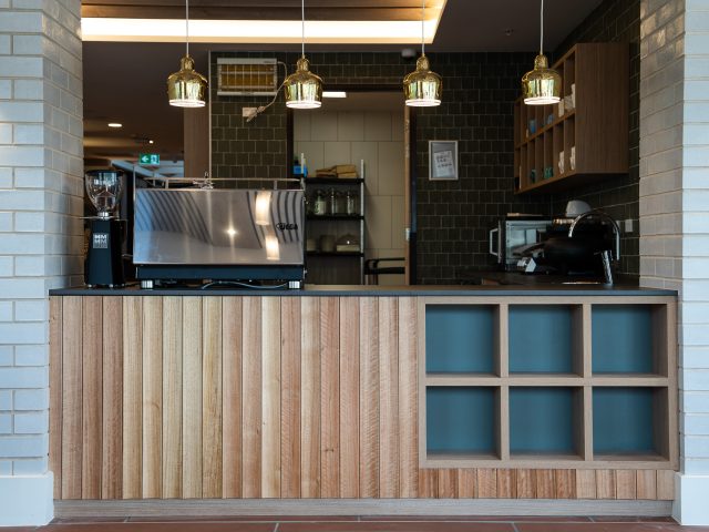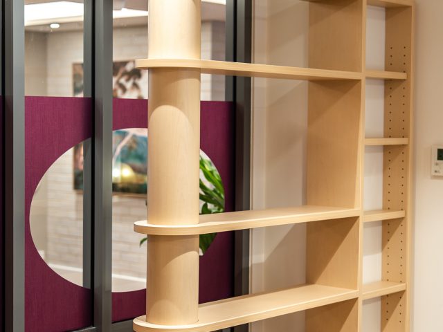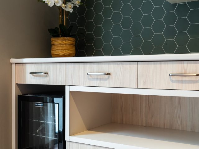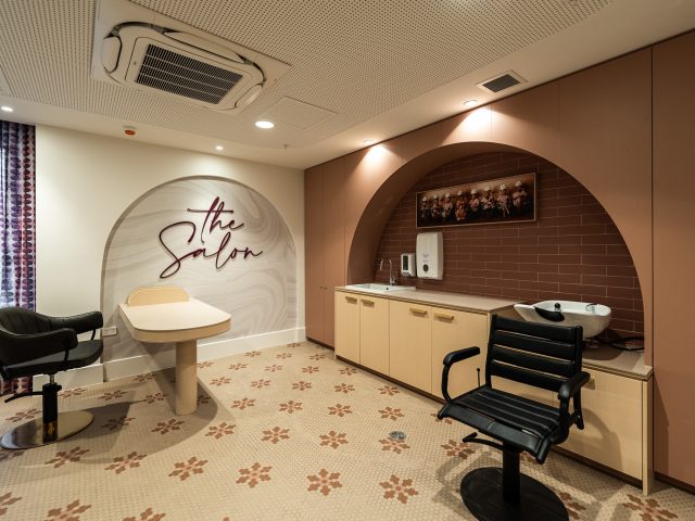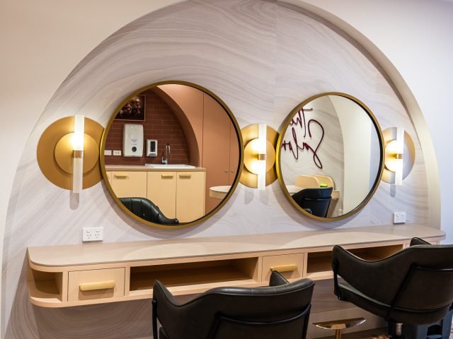 We also completed the full reception and café area, incorporating sleek benches, shelving, and integrated storage throughout. The on-site hair salon was fitted with curved cabinetry, mirrors, and open shelving to create a welcoming, professional environment. Additionally, we supplied and installed joinery across office spaces, delivering cohesive storage and workstation solutions.